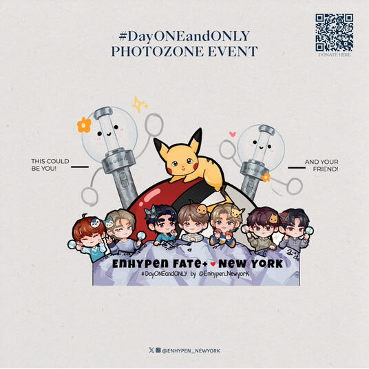 "WHO'S THAT ENGENE?"From the team that brought you #NYHeeDay & #ENHYPENOurDayOne, we proudly present our fan project for ENHYPEN FATE+ at UBS, #DAYOneAndONLY photo zone! (Our engene bong mascot from Manifesto says hello!)Very much like our #NYHee project, this event will be taking outside of UBS Arena before doors open where ENGENE can interact & take photos with the photozone. 🥹 We want to create a pre-concert experience that all ENGENE will enjoy.Our art team is the same team that brought you our wonderful Manifesto tour themed merch. They also are also the ones who illustrated both our #NYHeeDay photozone & #ENHYPENourDAYONE banner. We are super grateful to have them on the team once again, thank you Twin, Gunny & Dissu for all of your hard work!Please follow us on TWITTER & INSTGRAM